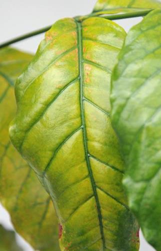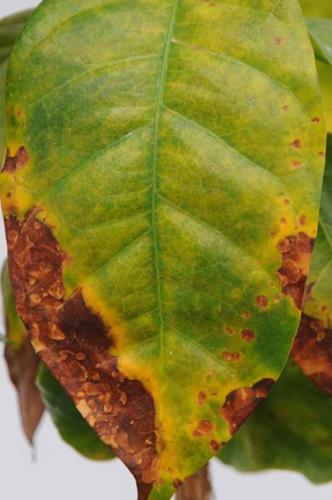 Los síntomas descritos aparecen primero en hojas viejas que luego se caerán si continúa la carencia.