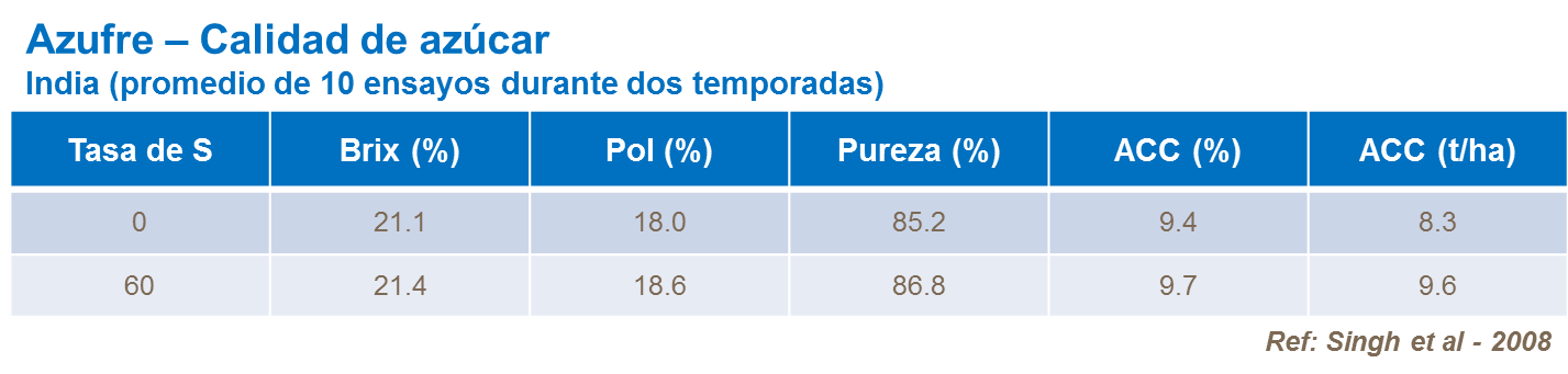Azufre tiene que aplicarse si la meta es mantener el rendimiento de azúcar en un cultivo de caña de azúcar. Investigaciones confirman que azufre tiene un efecto en un rango de características que influyen en la calidad del azúcar, incluyendo °Brix, Pol, pureza del jugo y ACC (Azúcar comercial de caña).