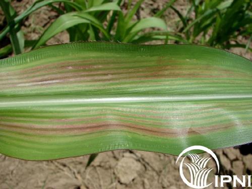 Los primeros síntomas consisten en clorosis internerval de las hojas más viejas. Conforme avanza la deficiencia las bandas amarillas muestran tonos rojizos y violáceos.