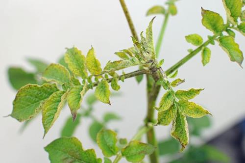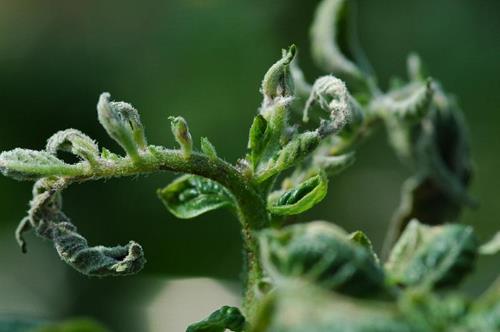 Se produce la deformación de las puntas de los brotes jóvenes puesto que los foliolos jóvenes no se desarrollan apropiadamente. El resto de las hojas que quedan presentan una necrosis marrón oscura.