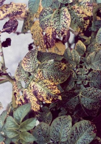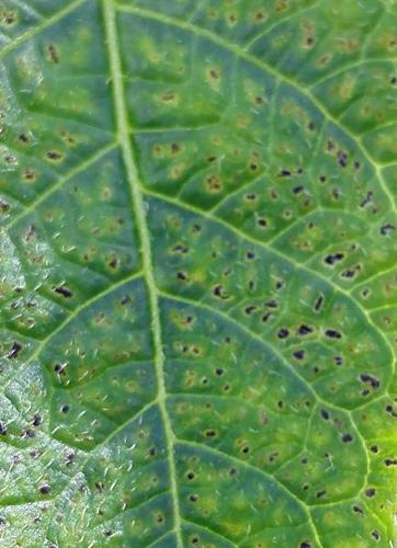 Los síntomas comienzan por las hojas más jóvenes, las hojas se vuelven verde pálido / amarillo y después desarrollan manchas negras a lo largo de la línea de las nervaduras.