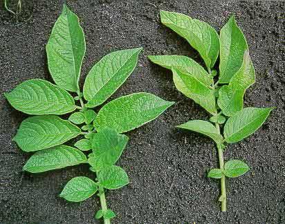 Las plantas de la izquierda presentan hojas de color verde pálido y crecimiento reducido.
