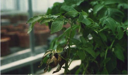 Las manchas se dan sobre todo cerca del anillo vascular en el final del estolón del tubérculo.